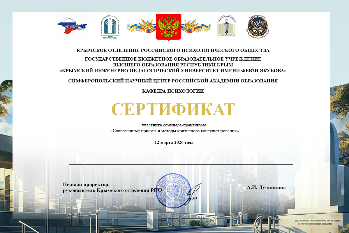 12 марта 2026 года на базе Крымского инженерно-педагогического университета имени Февзи Якубова прошел семинар-практикум «Современные приемы и методы кризисного консультирования». Мероприятие объединило специалистов в области психологической помощи, работающих с кризисными состояниями.